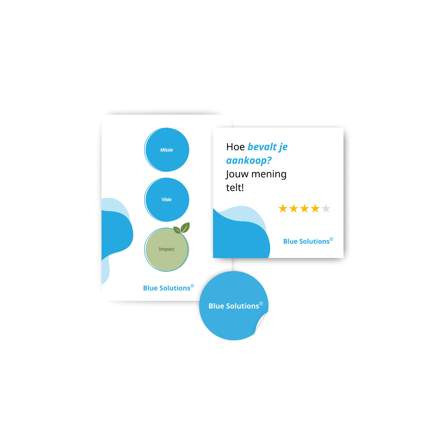 Om je volledig kennis te laten maken met Blue Solutions en je een stem te geven, voegen we enkele promotieartikelen toe aan elke bestelling. Deze items vind je in de doos bij je product en geven je een duidelijk beeld van wie we zijn en hoe we met jouw hulp blijven verbeteren.